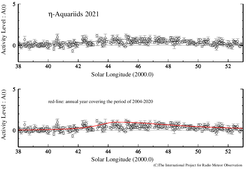 2021年のみずがめ座η流星群について,世界の流星電波観測データより,例年よりも弱めの活動が捉えられました.2021年は流星電波観測データ13カ国43データを使用しています.例年の活動(赤線)と比べると,おおよそ7割~8割程度の活動規模だったようです.これだけ活動レベルが低いのは2006年以来です.推定ピークは太陽黄経45°.145(5日17:30UT)でした.なお,2021年はロングエコーの出現数も少なく,全体的に低調だったようです.