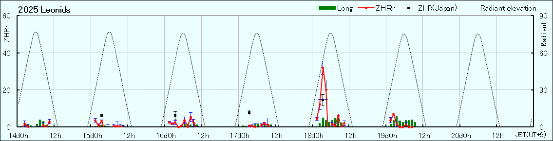 「ZHRr」は、各観測地のデータを「散在流星」で減算することで増加分を算出し、高度補正して求めています。眼視観測のZHRに相当します。「散在流星」は、11月3~16日の14日間のデータを平均して、散在流星の日周変化としています。