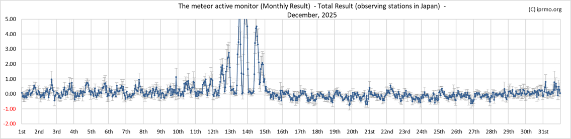 2025年12月度の日本国内流星電波観測者による電波観測結果の月次報告です.流星活動状況の報告,ロングエコーの出現状況などを掲載しています.