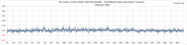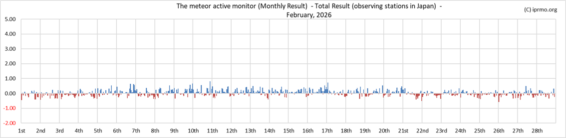 RMOJのデータに加え,狩野正樹様のデータも加えて算出しています。例年2月は主要流星群もなく、Activity Levelの値もゼロ近辺で推移します。その中でも2月8日~16日にかけては値がプラスに振れる時間帯が多かったのは特徴的でした(下図参照:青グラフがプラスの値)。理由は現時点ではわかりませんし、偶然の産物の可能性もあります。