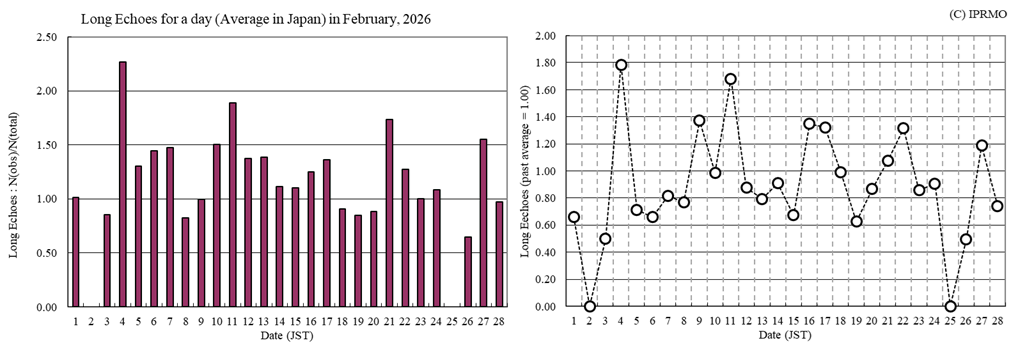2月のロングエコーは、1日1個前後の日が続きました。ただし、過去5年平均と比較すると、少なめの日が多かったようです。その中でも2月4日と11日は過去5年平均と比較すると多めでした。下左図が2月の国内における1日当たりのロングエコー数、下右図は過去5年平均との比較(過去平均=1.0)です。