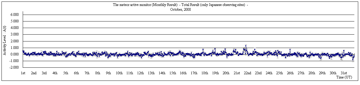このページは,毎月,全国の観測者から寄せられてくるデータが集約されたRMOJのデータを元にして,2008年の全国統合グラフ(Activity Level)を作成しています。月例報告では,あくまで国内の観測地点のみ統合グラフにしています。RMOJに関する詳しい事項はこちらのページをご覧下さい.(※各月のグラフをクリックすると別ウィンドウが立ち上がります)